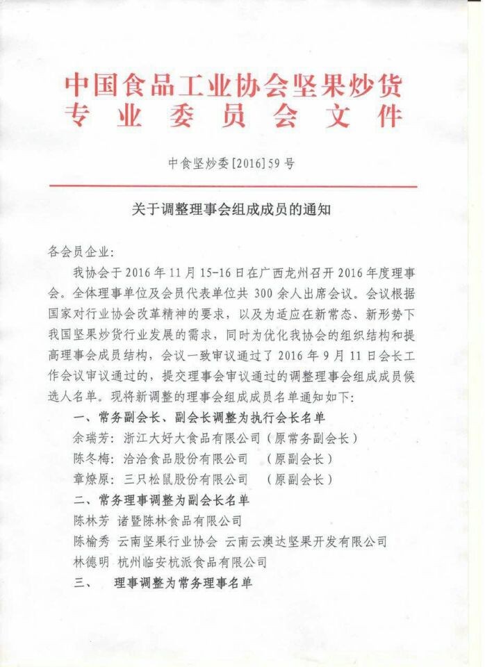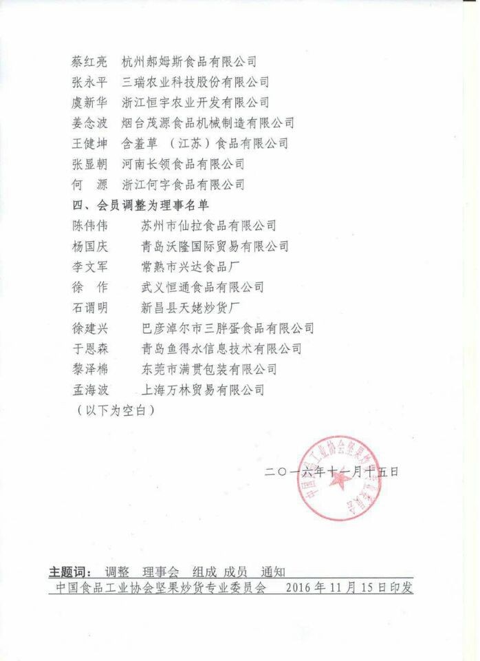 2016年11月15-16日,中國堅果協會年度理事會召開,中國堅果炒貨行業(yè)新的核心團隊誕生,全行業持續健康發展。我司總(zǒng)經理薑念波當選新一屆理事會常務理事。
