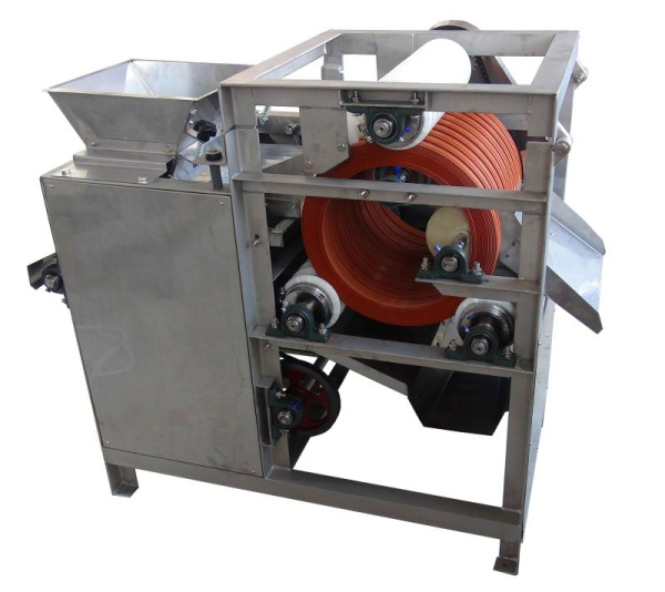 將經浸泡的蠶豆倒(dǎo)入料鬥,經震(zhèn)動進料(liào)使原料進(jìn)入由(yóu)三個動力輥固定(dìng)的旋轉膠輪之間的夾縫,在進料輪的作用下,經過刀(dāo)片(piàn)將原料外皮切口,然後(hòu)由出料輪排出。